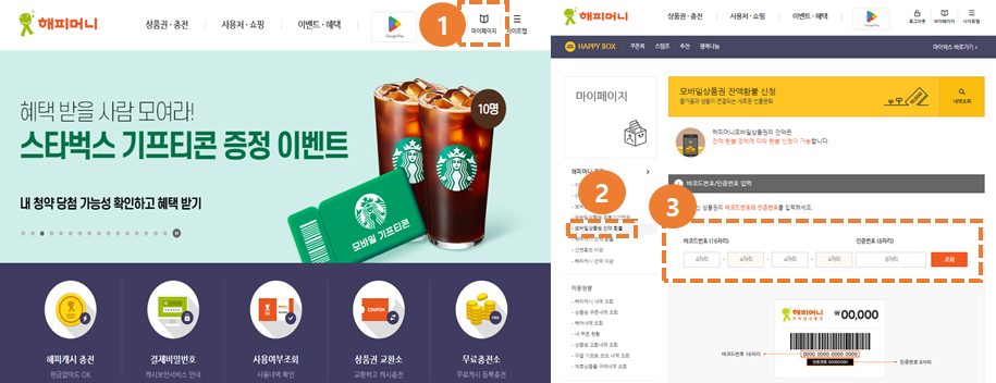 ②, ③ 마이페이지 목록에서 모바일 상품권 또는 해피캐시 잔액환불 중 원하는 기능을 선택 후 바코드번호와 인증번호를 입력 후 조회한 다음 절차대로 진행해 주시면 완료됩니다.