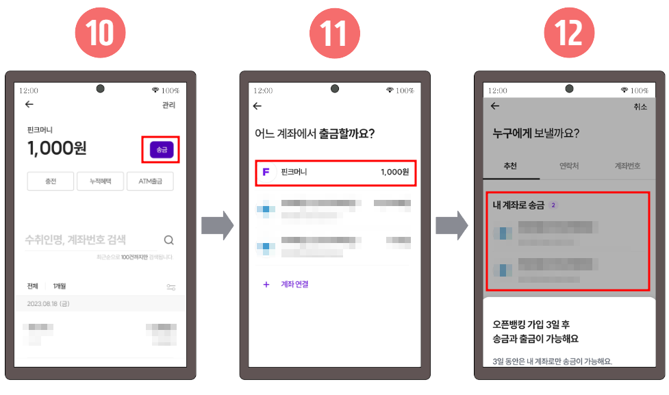 13~15. 내 핀크머니에서 내 계좌로 송금받을 금액을 입력한 다음 이름과 입금계좌가 맞는지 확인하신 후 "송금하기" 버튼을 클릭하면 최종적으로 현금화가 완료됩니다.
