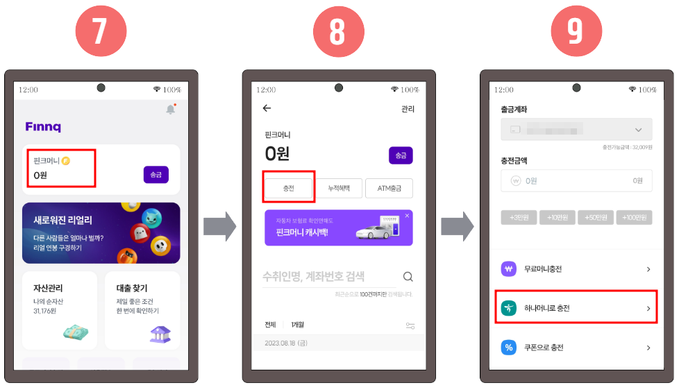 8~9. 그다음은 현금화할 핀크머니를 충전하기 위해 충전 버튼을 눌러 하단에 있는 "하나머니로 충전"을 클릭하면 보유한 하나머니 내에서 1원 단위로 수수료 없이 1회 최대 10만 원까지 전환하실 수 있습니다.