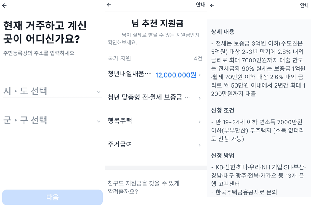 추가 지원금은 내일채움공제, 청년맞춤형 전월세 보증금, 행복주택, 주거급여 등 신청 가능한 다양한 지원 종류와 신청 조건 및 방법까지 지원해 줍니다.