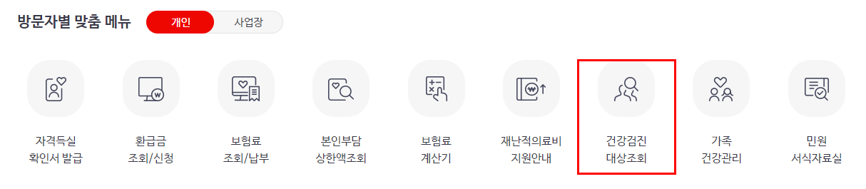 2. 홈페이지 메인화면 중간에 보시면 방문자별 맞춤 메뉴 7번째 항목 " 건강검진 대상 조회"를 눌러주십시오. 그다음 로그인을 진행하지 않으셨다면 공동/금융인증서를 통해 바로 진행이 가능합니다.
