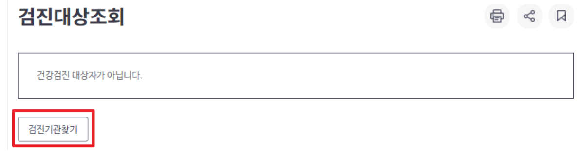 건강검진 대상자일 경우 검진 가능한 기관을 찾아서 진행해야 합니다. 기관을 찾는 방법은 아래 조회 결과 아래 검진기관 찾기를 눌러주시면 기관 조회가 가능합니다.