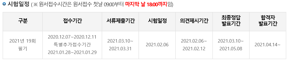 | 19회 필기 | 20.12.07~20.12.11 | 21.01.28~2.01.29 | 21년02월06일 | 21년04월14일~ |
