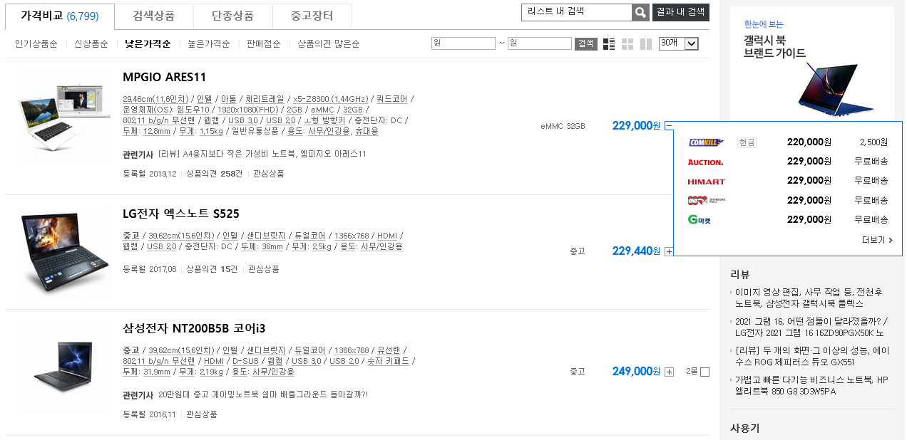 비교 전문 사이트 다나와를 이용하시면 비슷한 사양의 컴퓨터 및 노트북 가격을 비교해보실 수 있습니다. 사이트에 들어가셔서 좌측 목록의 컴퓨터, 노트북, 조립 PC 관련 항목 중 노트북 전체 클릭을 해주시면 상세검색 페이지가 나옵니다. 가성비 좋은 노트북은 무작정 좋고 비싼 노트북을 구매하기보단 나의 사용 용도에 맞는 사양을 선택하려 비교적 저렴하게 구매하는 것입니다.