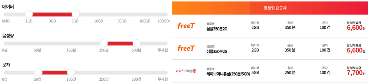 옵션 선택 후 검색하여 조회하시면 낮은 요금 순으로 비교 가능합니다. 가장 적합한 상품을 고르셔서 가입을 진행하시면 됩니다.