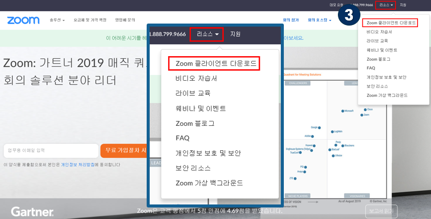 3. 홈페이지가 뜨며 오른쪽 상단 리소스란에 Zoom 클라이언트 다운로드를 클릭해 주길 바랍니다.