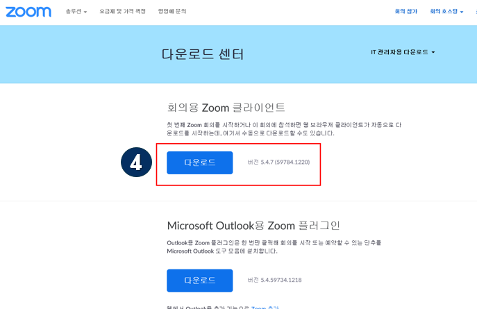 4. 다음으로 다운로드 센터 창이 나오면 회의용 Zoom 클라이언트 파란색 다운로드 버튼을 클릭하시면 됩니다.