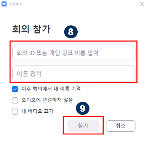8. 회의 ID나 개인 링크 입력을 해주시고 참가 버튼을 눌러주시면 됩니다.