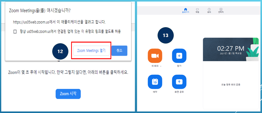 12. 그림과 같이 Zoom Meetings 열기를 눌러주시면 13. 그림처럼 프로그램이 실행이 됩니다.