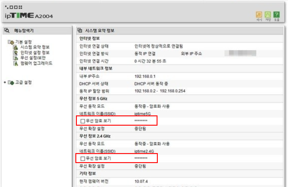 ④ 관리 도구에 들어오셨으면 위 그림과 같이 무선정보에 대해 알 수 있습니다. 현재 사용하시는 와이파이의 이름을 확인하신 후 무선암호 보기 체크 사각 박스를 클릭해 주시면 와이파이 암호******가 정상적으로 표기됩니다.