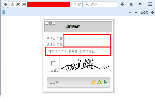 ② 다음으로 로그인 및 암호, 이미지 문자를 입력하고 로그인해 줍니다. 혹시 이름, 암호가 기억이 나지 않으신 분들은 초기 세팅으로 이름 admin 암호 admin이 설정되어 있으니 시도해보시고 틀리다면 초기화를 진행해보셔야 할 것 같습니다.