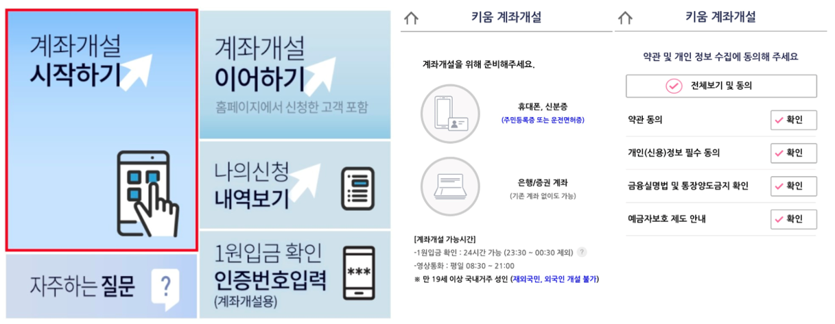 2. 모바일 또는 홈페이지에서 진행 가능하며 가장 먼저 계좌개설 시작하기를 눌러 넘어간 후 약관 및 개인 정보 수집에 동의하시면 휴대폰 인증을 하셔야 합니다. 휴대폰 인증이 완료되었다면 자금 원천, 출처/목적/번호/주소 등 개인 정보를 넣으시고 거래 상품 선택하고 금융거래 목적 확인서 작성 후 신분증 진위 확인을 해주시면 됩니다. 그다음 마지막으로 간편인증 PIN 번호 6자리를 등록을 하면 완료됩니다.