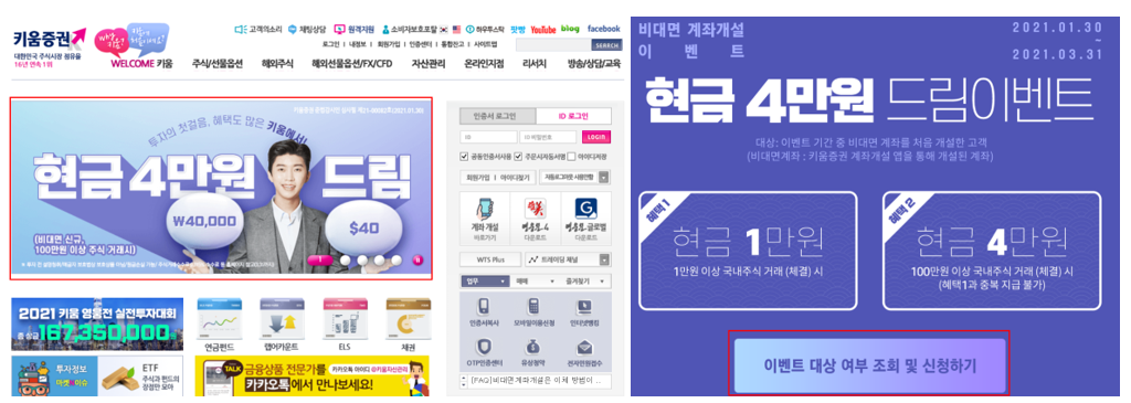 1. 포털사이트에 키움증권을 검색하셔서 홈페이지로 들어가셔서 임영웅 씨가 모델로 있는 "현금 4만원 드림" 이벤트 베너를 클릭하여 이벤트 대상 여부 조회 및 신청하기를 눌러 진행해 주세요. 그러면 성명, 번호를 입력 후 개인 정보 수집에 동의하고 신청하면 대상 여부를 판단하여 대상이 맞다면 바로 진행할 수 있습니다.