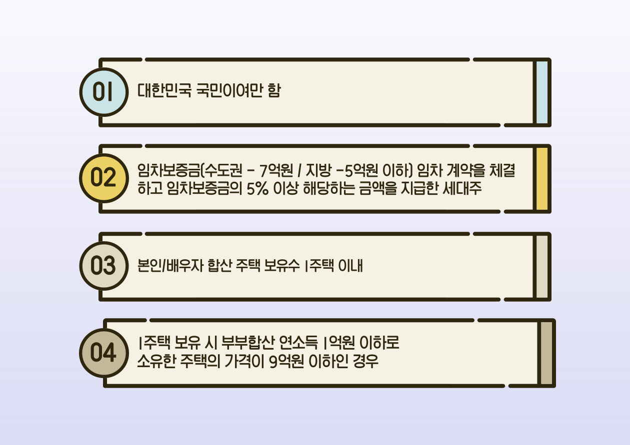 우선 대한민국 국민으로 임차보증금이 수도권 기준 7억 원 이하, 지방 기준 5억 원 이하인 임대차 계약을 체결하고 임차보증금의 5% 이상의 해당하는 금액을 지급한 세대주면 신청가능합니다.