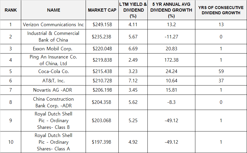 올해 2월 기준 시가총액 2,491억 5000만 달러로 1위를 차지한 배당 기업은 Verizon Communications Inc입니다. 지난 12개월 배당수익률이 4.11%로 10위 기업 중 7위로 중간이지만 표의 마지막 YRS OF CONSECUTIVE DIVIDEND GROWTH 을 보시면 13년 동안 꾸준히 배당금을 인상해왔고 최근 5년간 평균 13.2%를 인상한 점을 본다면 주주들에게 우호적이다는 것을 알 수 있습니다.