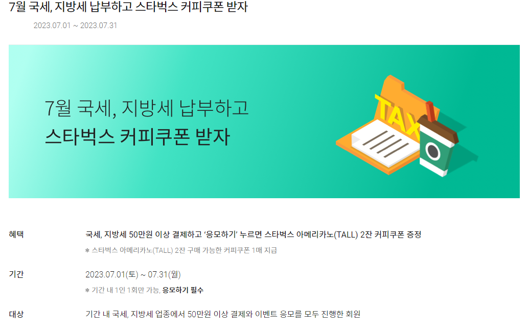 롯데카드에서는 이벤트 기간 내 국세, 지방세(재산세 포함) 50만 원 이상 결제 시 카드사 홈페이지를 들어가서 응모하기를 누르면 응모한 모든 분들에게 스타벅스 아메리카노 2잔 구매가능한 커피쿠폰 1매를 지급하고 있습니다.