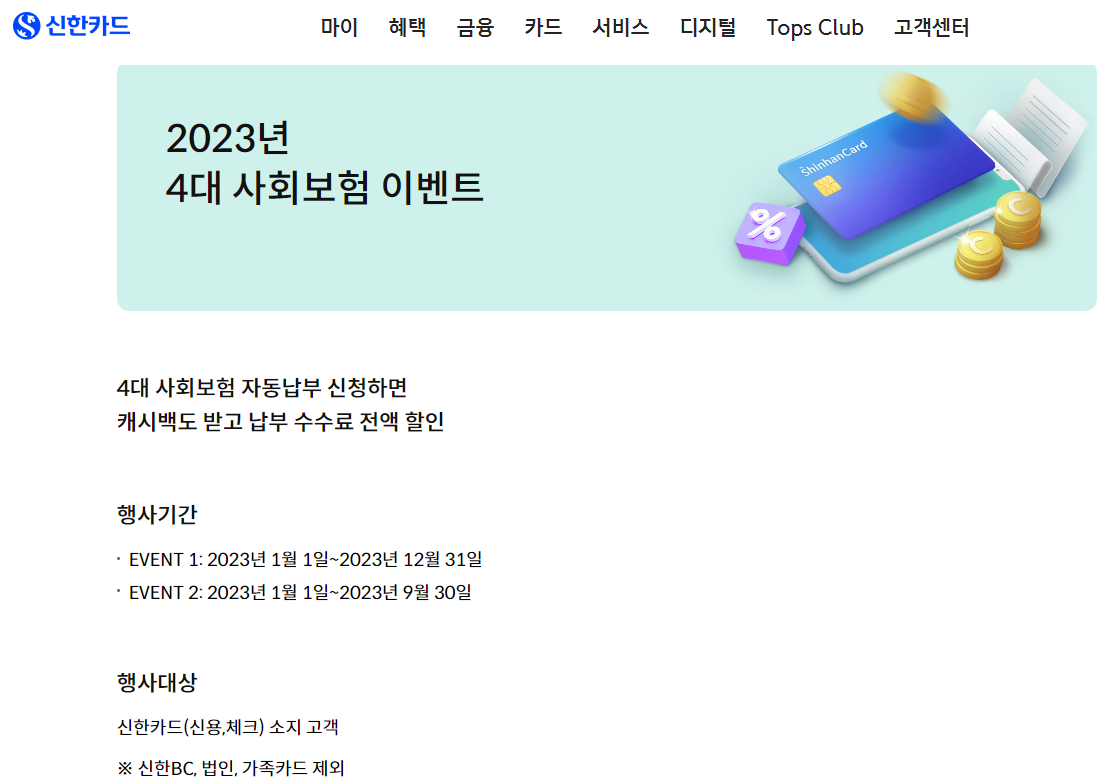 현재 신한카드에서는 신용 및 체크카드 소지 고객을 대상으로 4대 사회보험 자동납부 신청 시 행사기간에 따라 캐시백부터 수수료할인까지 2가지 혜택을 받으실 수 있으며 신한 BC, 법인, 가족카드는 제외되니 참고 바랍니다.