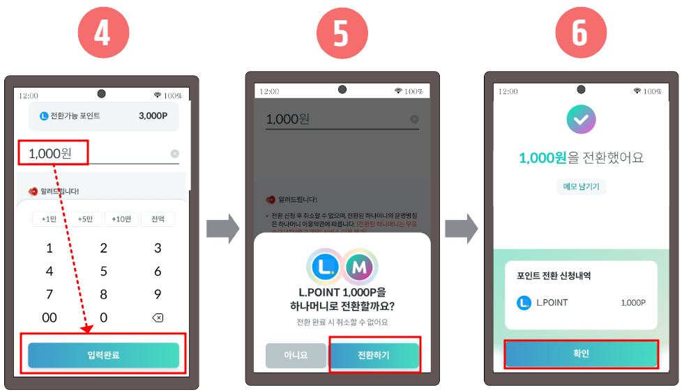 4~6. 전환가능한 엘 포인트 내에서 전환하고자 하는 금액을 넣고 입력완료를 누르시고 최종적으로 진행을 원하신다면 "전환하기"버튼을 클릭 후 확인하시면 완료됩니다. 전환 완료 시 취소할 수 없다는 점 유의하시길 바랍니다.