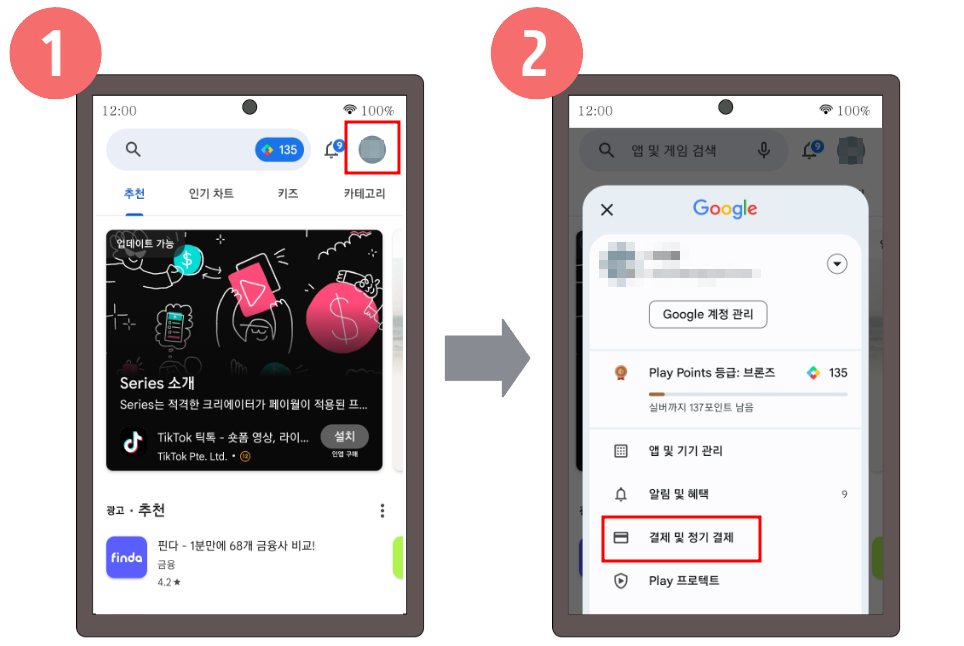 1. 스마트폰 Play 스토어 앱 실행 후 우측 상단에 위치한 프로필 아이콘을 클릭합니다.