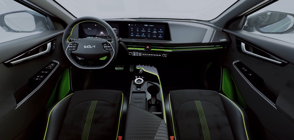 사이드미러에 카메라 타입이 적용되지 않았고 리어 부분의 램프는 가로로 길게 연결되어 점선형 타입을 보여주고 있으며 방향지시등은 시퀀셜 타입으로 구성되었고 리어 와이퍼는 포함되지 않았습니다. 후미 상단의 윙 타입 루프 스포일러는 EV6에 더욱 스포티한 모습을 표현해 주고 있습니다. 또한 내부 디자인은 초록색 계열과 조화를 이루고 있으며 가로로 된 조명들이 더욱 멋진 분위기를 연출해 주며 스티어링 휠의 경우 일반 및 D 컷 둘 다 존재합니다. 운전석 전면엔 파노라믹 커브드 디스플레이와 LCD로 된 컨트롤 패널이 차량 내부를 더욱 고급스럽게 해주고 다이얼 방식의 기어를 적용하였으며 또 시동 버튼은 전자제품의 전원 버튼을 연상케 하고있습니다. 내부 시트는 릴렉션 컴포트 시트가 마련되었지만 아이오닉5와 달리 시트 사이에 유니버셜 아일랜드는 적용되지 않았습니다.