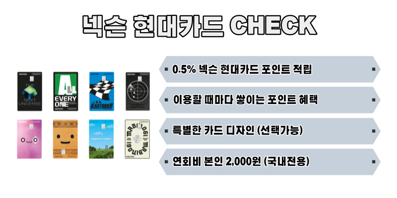 넥슨 현대카드 CHECK는 실적 조건 없이 최대 50만 원까지 국내 가맹점 이용금액의 0.5%를 넥슨 현대카드 포인트로 적립받을 수 있는 체크카드로 매출전표 매입 시점 기준으로 1~2 영업일 후 적립받으실 수 있습니다.