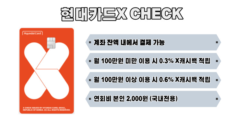 현대카드 X CHECK는 X캐시백 적립 체크카드로 월 사용금액 100만 원을 기준으로 0.3%/0.6% 캐시백을 받으실 수 있습니다. 1X캐시백은 1원으로 환산되며 적립된 X캐시백은 별도 신청 없이 월 1회, 매월 10일마다 결제계좌로 자동 입금되지만 주말, 공휴일인 경우 다음 영업일에 입금됩니다.