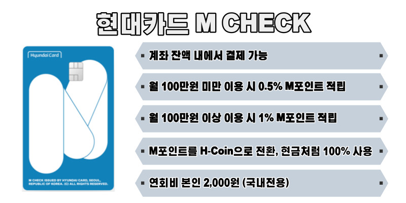 현대카드 M CHECK 계좌 잔액 내에서 결제되는 M포인트 적립 체크카드로 월 사용금액 100만 원을 기준으로 0.5%/1% 적립을 받으실 수 있습니다. 단, 연회비, 제수수료, 이자, 지방세, 국세 등 세금 납부액, 대학/대학원 등록금 납부 건, 자동납부서비스 이용수수료는 적립대상에서 제외됩니다.