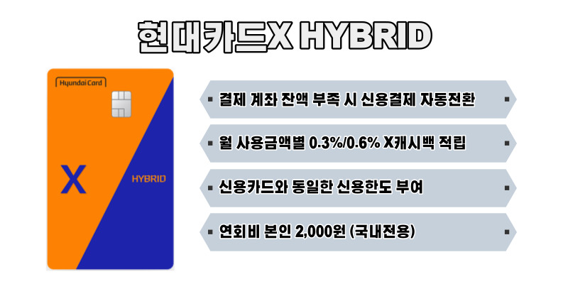 현대카드 X HYBRID는 X캐시백 적립 가능한 하이브리드카드로 체크카드 기능은 물론 신용카드와 동일한 한도가 부여되기 때문에 자금이 부족할 때 유용하게 사용할 수 있고 월 사용금액에 따라 0.3%/0.6% X캐시백 적립 혜택까지 받을 수 있습니다.