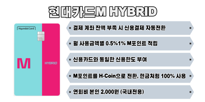 현대카드 M HYBRID는 M포인트 적립 가능한 하이브리드카드로 결제 계좌 잔액 부족 시 신용결제 자동전환은 물론 월 사용금액별 M포인트 적립 혜택까지 받아보실 수 있습니다. 월 100만 원 미만 이용 시 0.5%, 월 100만 원 이상 이용 시 1%의 M포인트를 적립받을 수 있고 H-Coin으로 전환 후 현금처럼 사용하실 수도 있습니다.