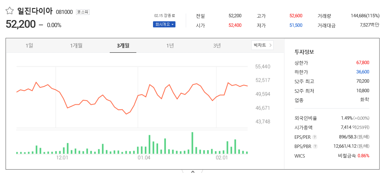 2004년 12월 설립되었으며 공업용 다이아몬드, 정밀소재 등 생산 및 판매를 주요 사업으로 영위하는 기업입니다. 일진다이아의 공업용 다이아몬드는 자동차, 건축, 금속, 기계, 토목, 전산 등 거의 대부분의 분야에서 사용되고 있으며 자회사 일진복합소재를 통해 수소탱크사업을 영위 중이며 2014년부터 수소탱크 양산을 하고 있습니다.