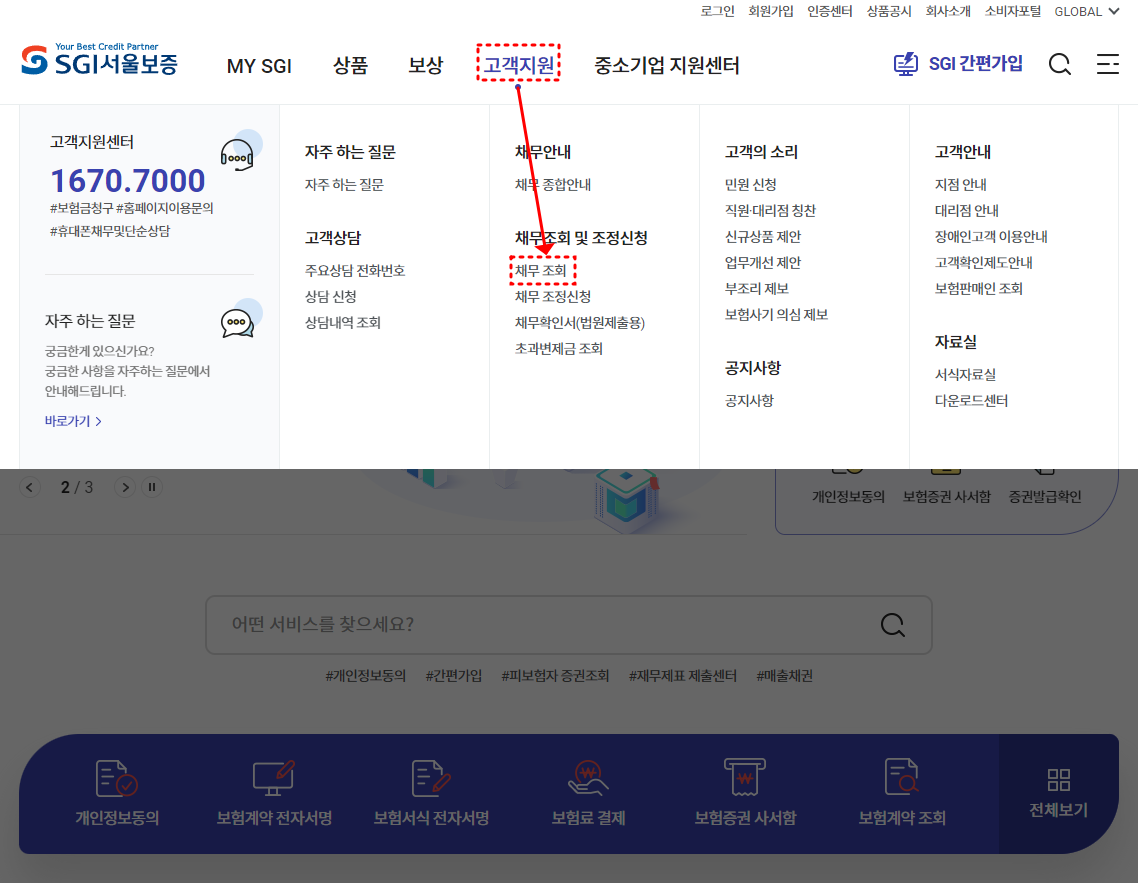 서울보증보험 미납 금액 조회는 SGI 서울보증 고객센터 전화 문의 또는 홈페이지 접속을 통해 간편하게 확인해 보실 수 있습니다. SGI서울보증 홈페이지를 접속해서 회원가입 및 로그인 후 화면 상단 고객지원 메뉴에서 채무 조회를 클릭하시면 됩니다.