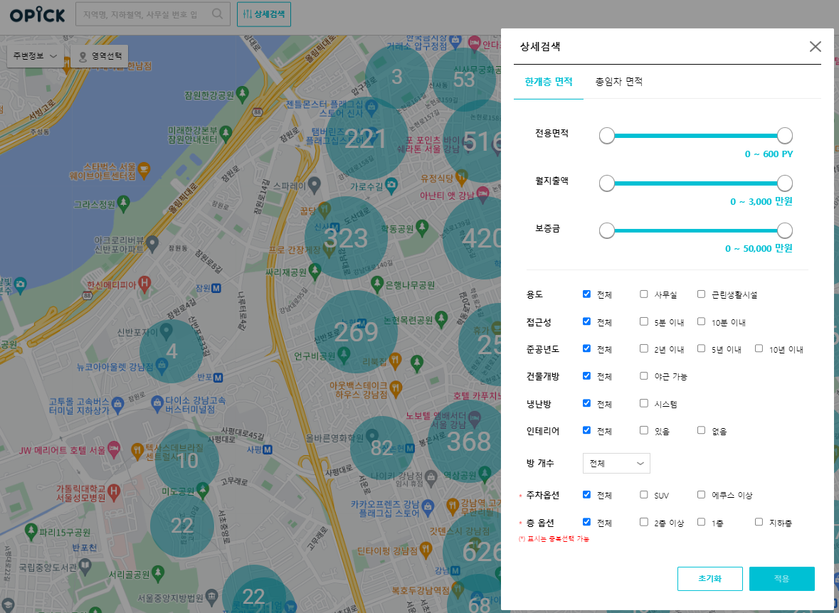 오피스픽은 사무실의 전용면적, 월지출액, 보증금의 범위를 원하는 조건으로 설정이 가능하며 추가로 용도, 접근성, 냉난방, 인테리어 여부, 방 개수, 주차 등 여러 가지 옵션을 선택할 수 있고 궁금한 사항을 부동산 전문가를 통해 무료로 문의해 보실 수 있습니다.