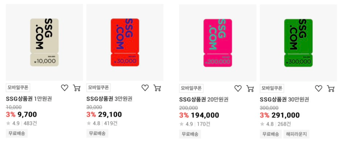 보통 상품권마다 구매할 수 있는 경로와 결제가능한 방식이 조금씩 다르기 때문에 판매처를 비교하여 가장 저렴하게 살 수 있는 곳을 찾으시는 것이 좋습니다.