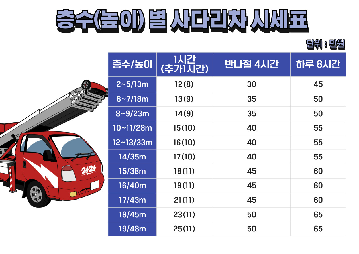사다리차 비용은 아파트 층수 또는 오피스텔 및 빌라 높이에 따라 기본적인 요금이 책정되고 사용 시간이 늘어날수록 추가 비용이 발생됩니다. 만약 이용 시간이 길면 반나절(4시간)이나 하루(8시간) 대여하신다면 비용을 절약할 수 있고 또한 업체마다 금액이 조금씩 다를 수 있기 때문에 가격 협의 또는 견적 비교 후 저렴한 곳을 통해 진행하시는 것이 좋습니다.