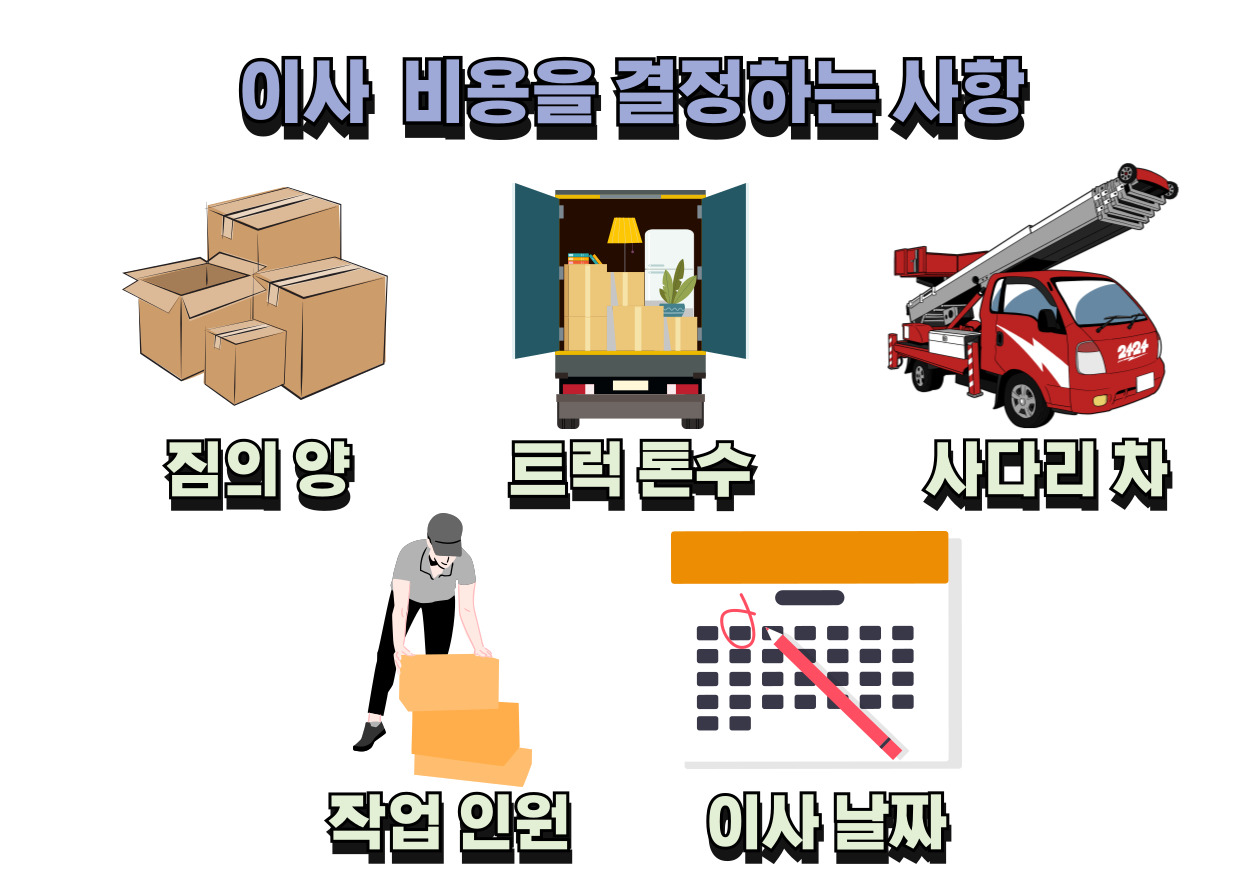 보통 포장 이사 비용이 집 평수가 클 수록 비싸다고 생각하실 수 있지만 정확히는 짐의 양이나 운반 방식(사다리차 유무) 및 거리 등 여러 사항들을 고려하여 비용이 정해지기 때문에 집 평수가 작아도 견적이 올라갈 수 있기 때문에 이사 비용과 관련된 사항들을 자세히 짚고 넘어가겠습니다.