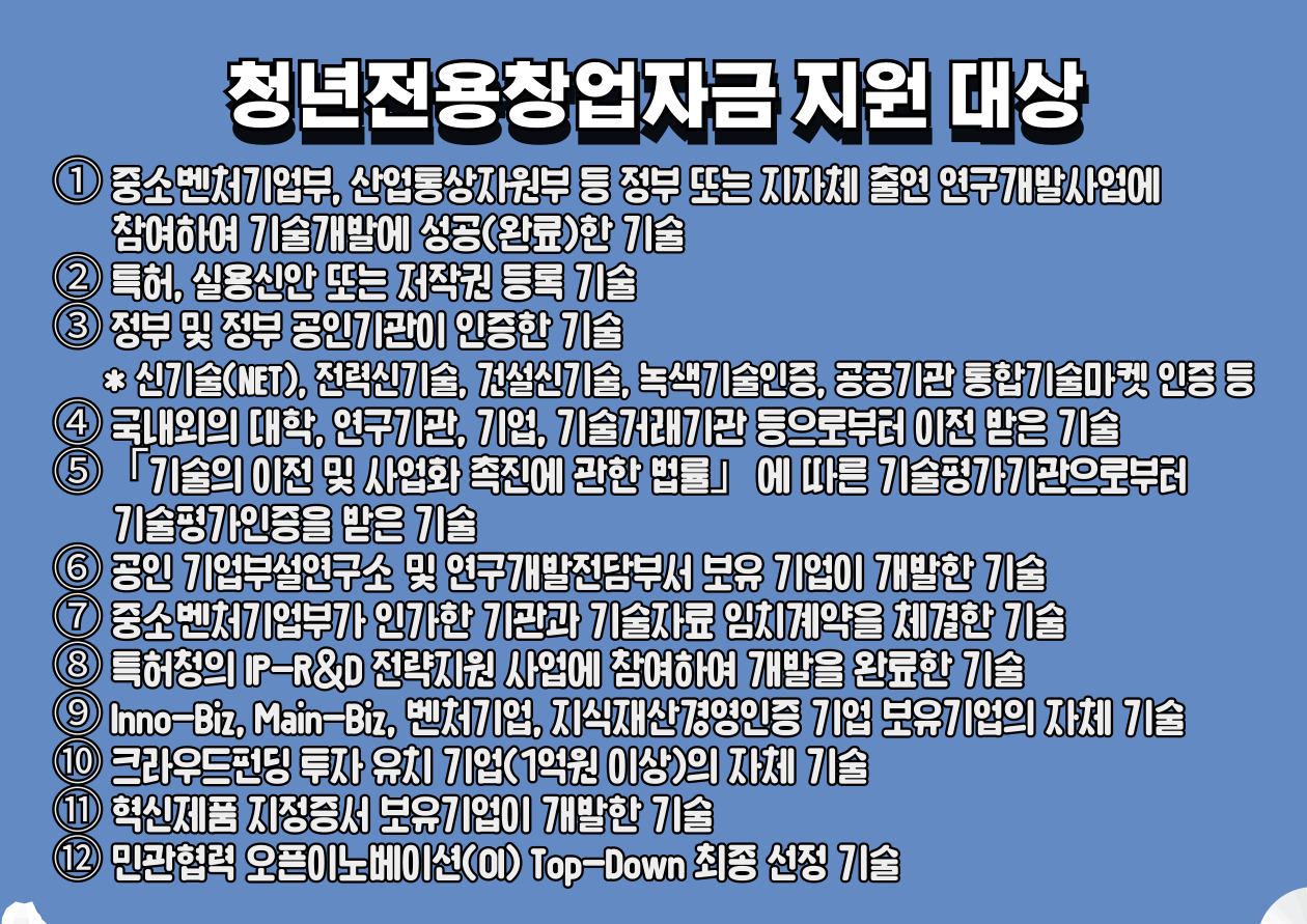 아래에 해당하는 기술을 사업화하고자 하는 중소기업을 대상으로 하지만 제품 양산 후 3년이 경과한 기술은 제외되지만 초격차 분야 기술은 5년까지 가능하니 참고 바랍니다.