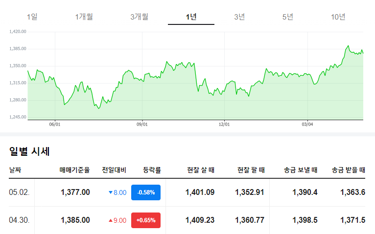 위 그림과 같이 네이버페이 증권을 통해 환율을 보게 되면 하나은행과 신한은행을 기준으로 기간에 따른 환율추이를 한눈에 그래프로 확인할 수 있고 날짜 별 매매기준율과 전일 대비 등락률까지 비교해 보실 수 있으니 환율이 낮은 타이밍에 맞춰 환전해 보시길 바랍니다.