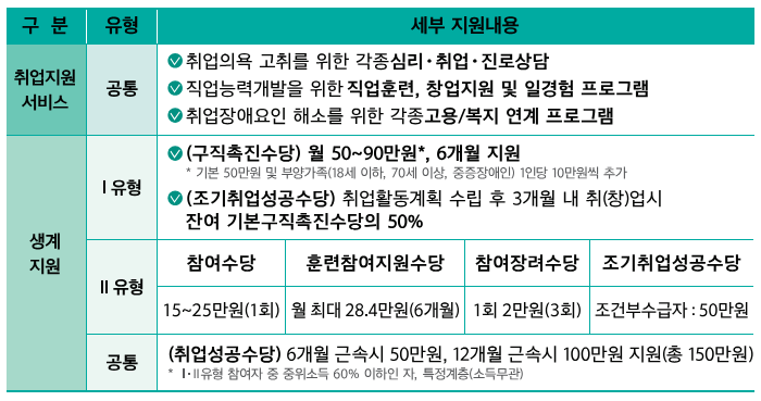 | ⑦ 사후관리 | - 미취업자: 취업지원서비스 종료일 이후 3개월 동안 구인 정보 제공 등 사후관리 - 취업자: 장기 근속 유도를 위한 취업성공수당 지원 |