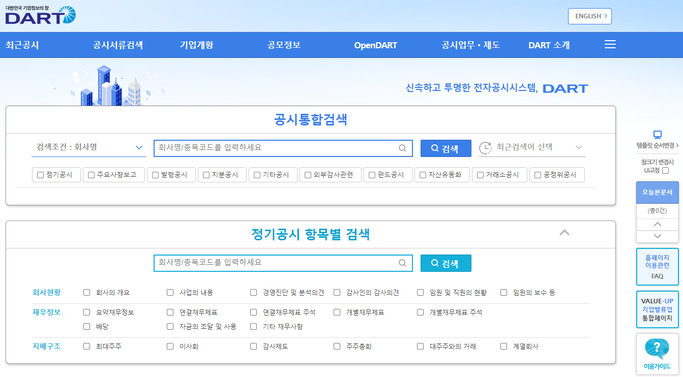 전자공시시스템이란 상장법인 등 기업이 공시서류를 제출하면 정보이용자가 제출 즉시 인터넷을 통해 정보를 조회할 수 있는 종합적 기업공시 시스템으로 기업의 재무 상태 및 경영실태를 파악하기 위해서는 이 사이트를 꼭 알아두시는 것이 좋습니다.