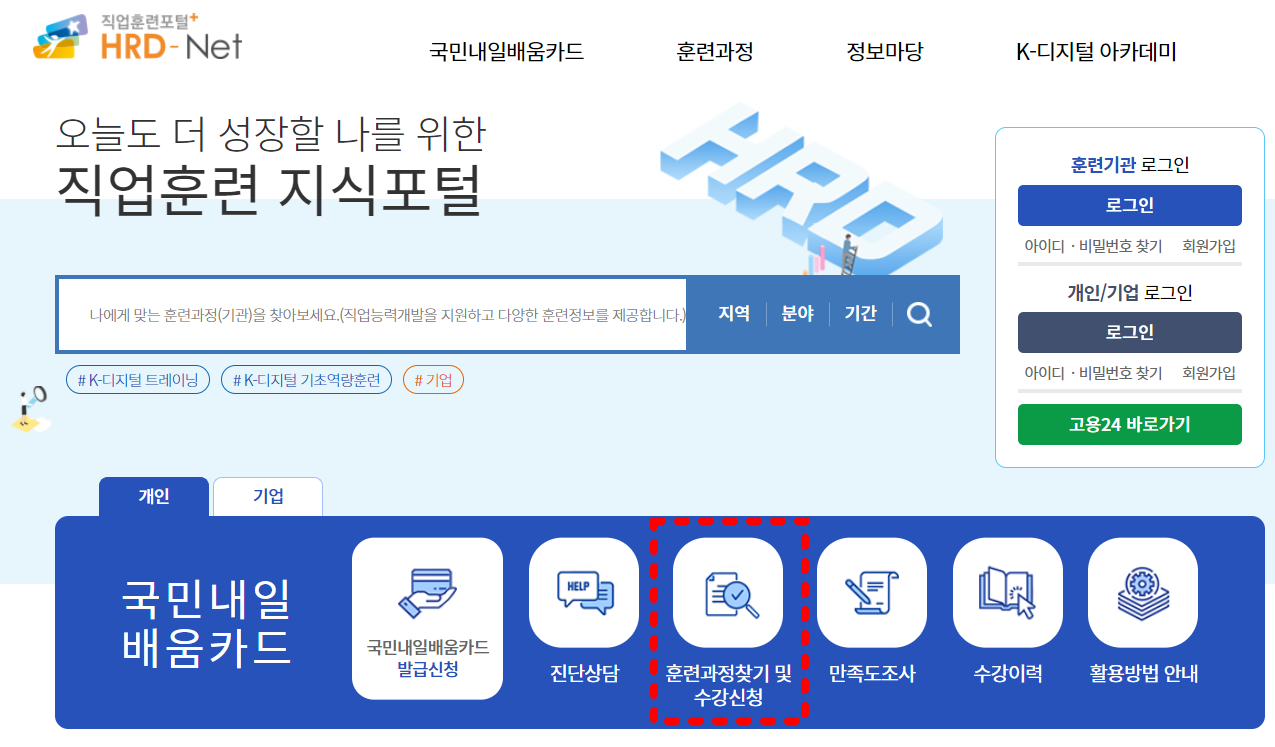 국민내일배움카드 발급 신청 후 카드를 수령받고 수강신청을 원한다면 HRD-Net 홈페이지 메인화면에서 '훈련과정 찾기 및 수강신청'을 클릭합니다.