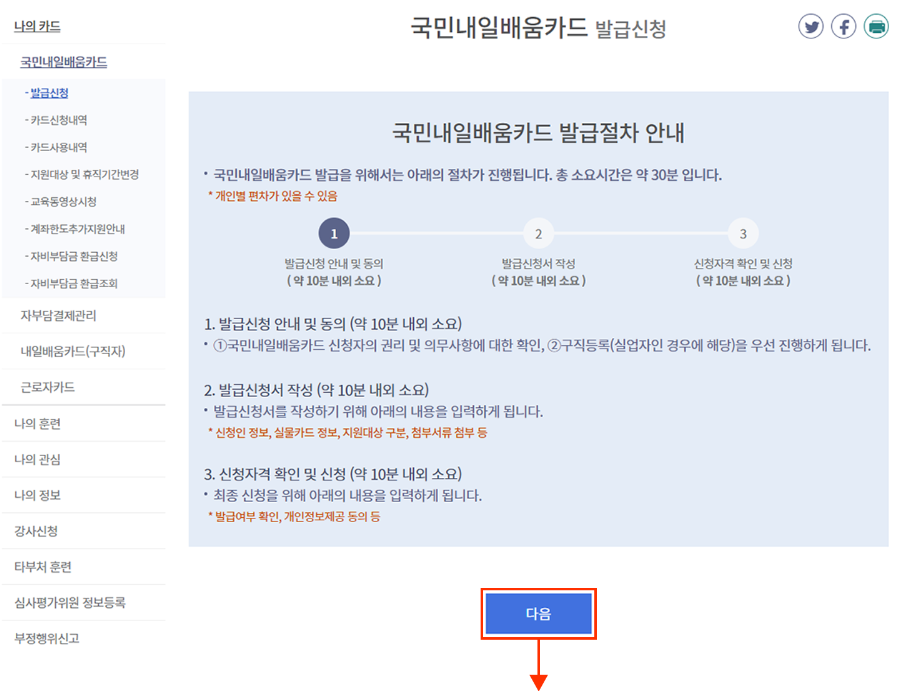로그인 후 나의 정보 페이지에서 나의 카드 > 국민내일배움카드 > 발급신청 순으로 이동합니다.