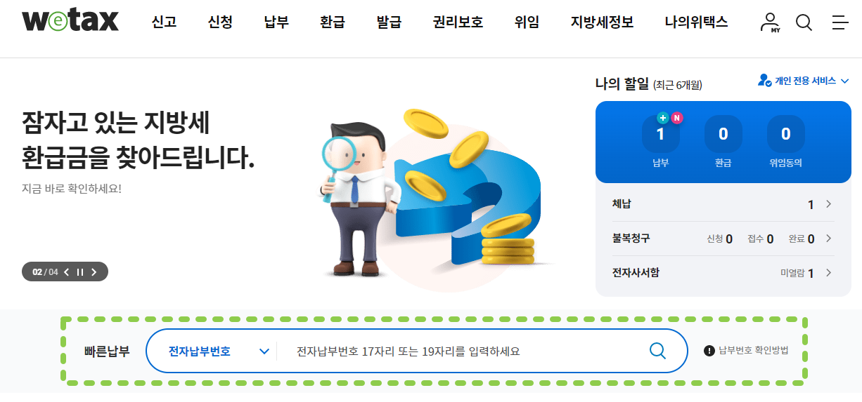 우편으로 자동차 취득세 납부고지서를 받았다면 위택스 홈페이지 접속 후 첫 화면 보이는 빠른 납부 검색창에 전자납부번호 17자리 또는 19자리 입력하면 금액 확인 후 세금을 납부하실 수 있습니다.