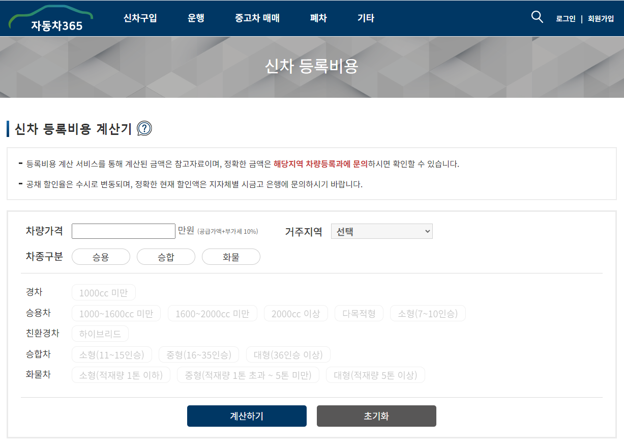 자동차 취등록세에 대해 궁금하다면 '자동차 365'라는 홈페이지를 통해 조회가 가능합니다. 별도의 로그인 없이 차량가격, 거주지역, 차종구분, 배기량(cc) 등의 정보만 입력하면 등록비용을 계산해 보실 수 있습니다.
