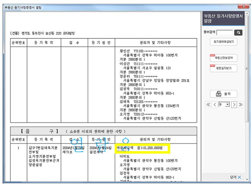 먼저 융자 있는 집을 계약하기 앞서 등기부등본상에 기재된 융자 규모를 꼭 체크해 보시길 바랍니다. 등기부등본상을구 소유권 이외의 권리에 관한 사항에 보시면 권리자 및 기타 사항에 채권최고액이 얼마인지 확인해 보실 수 있습니다.