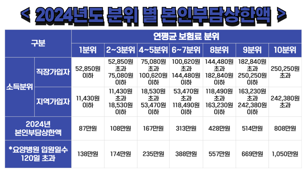 본인부담상한액은 건강보험료 기준 가입자(세대 기준)의 소득 수준에 따라 1~10 분위로 나뉘며 소득 수준별 개인 상한액 초과금은 가입자의 전년도 보험료 정산 후 종합소득신고 반영을 고려해서 다음 연도 8월 말에 연평균 보험료를 적용해 지급하고 있습니다.