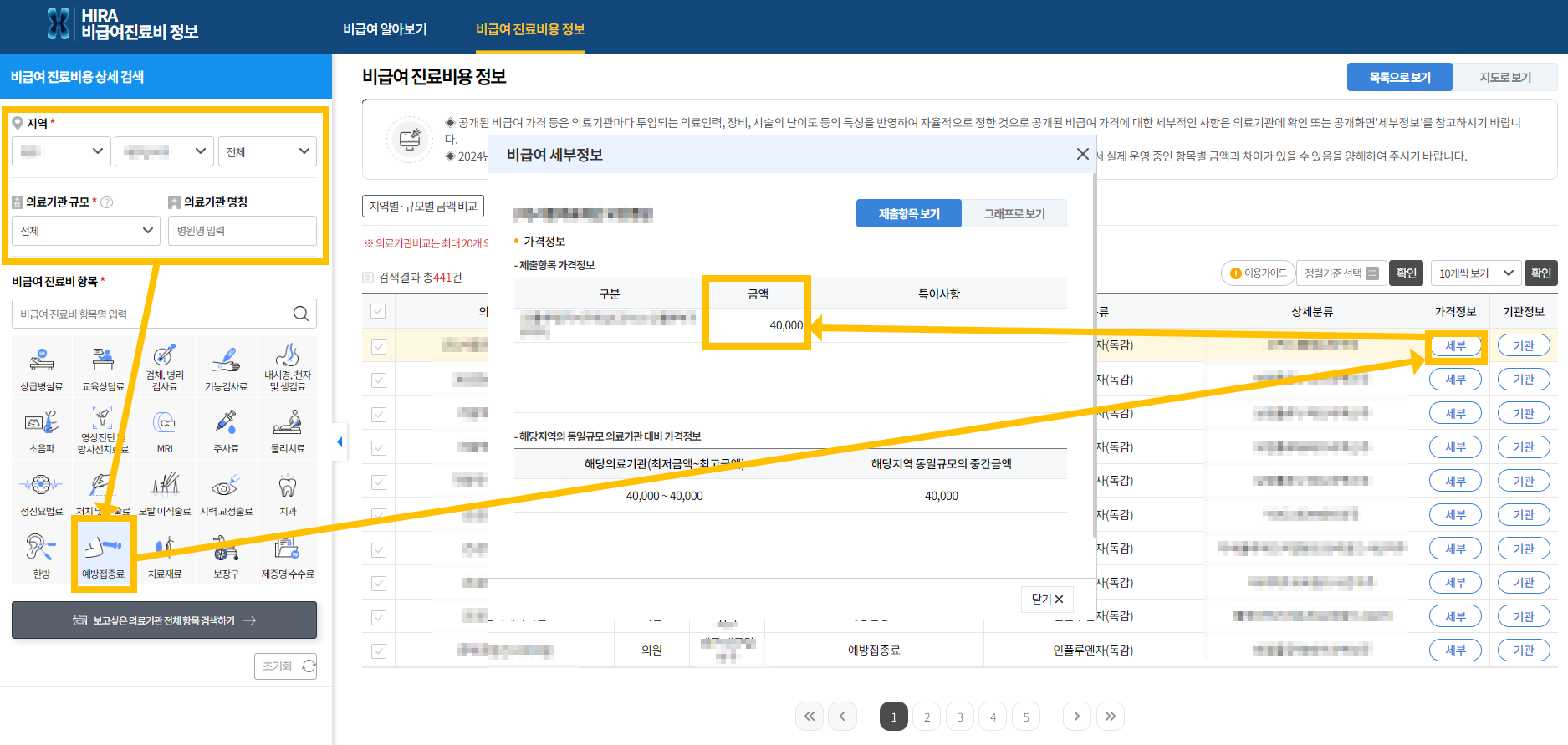 PC 또는 모바일 앱을 통해 건강보험심사평가원에 접속한 후 비급여 진료비용 상세 검색창에서 지역, 의료기관 규모, 비급여 진료비 항목을 입력한 후 검색하면 그 지역에서 독감예방접종을 취급하는 의료기간을 찾아보실 수 있습니다.
