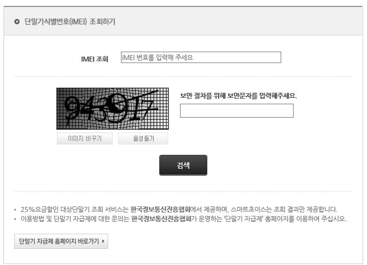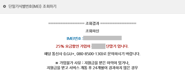 8. IMEI 번호와 보안 문자를 넣으신 후 검색하신다면 아래 그림과 같이 25% 요금할인 가입이 가능한 단말기인지 아닌지 바로 확인이 가능합니다.