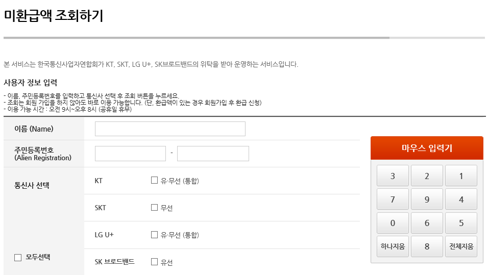 4. 미환급액 조회하기를 누르셨다면 아래의 그림같이 사용자 정보 입력란이 나옵니다. 이름/주민번호/통신사 선택 후 순서대로 진행하면 완료가 됩니다.
