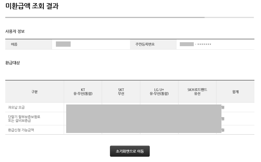 5. 별도로 회원가입 없이 쉽게 조회가 가능합니다. 위 정보 입력을 넣고 조회하기를 하셨다면 아래와 같이 미환급액 조회 결과를 확인하실 수 있습니다. 간단한 사용자의 정보와 함께 과오납 요금, 단말기 할부보증보험료 또는 설비보증금, 환급신청 가능금액이 표시되어 합계금액을 알아보실 수 있습니다.
