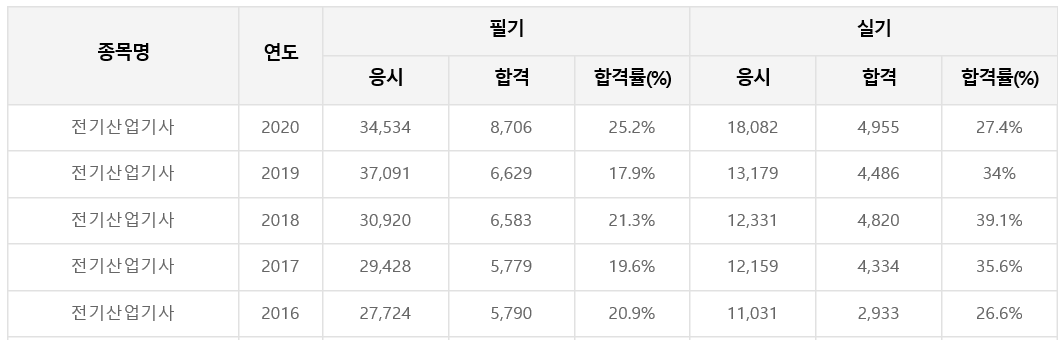 전기산업기사의 필기 합격률은 기사 시험에 비해 낮지만 실기시험의 합격률은 전체적으로 높은 경향으로 기사 시험에 비해 난이도가 낮을 거라 추측해봅니다.
